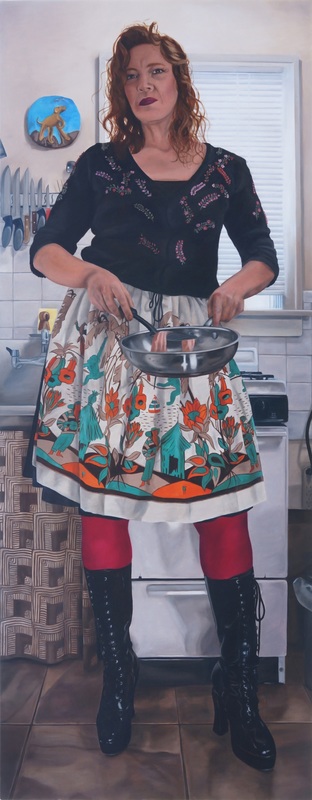 Is that a little bit too much of an over-read? Maybe. But I don’t think so. Consider what else we can see in the kitchen. Consider the knives, a classic phallic symbol, hanging over Hallie’s right shoulder. These are her knives, her symbols of power—that is, if you accept the phallic as a symbol of power. And there are a lot of them. Well, of course she has knives, you might say; she’s working in a kitchen. But take a look at Haven Takes after Her Mom. This painting seems to be set in the same kitchen, but no knives are visible—or maybe just part of one, the smallest one, from the set in Hallie’s painting. An artist chooses what she wants to display. The bacon could have remained in the pan, out of sight, but it didn’t. It could have been crisped and hard, but it isn’t. Instead of knives in the background, Lockheart could have included flowers. She didn’t.